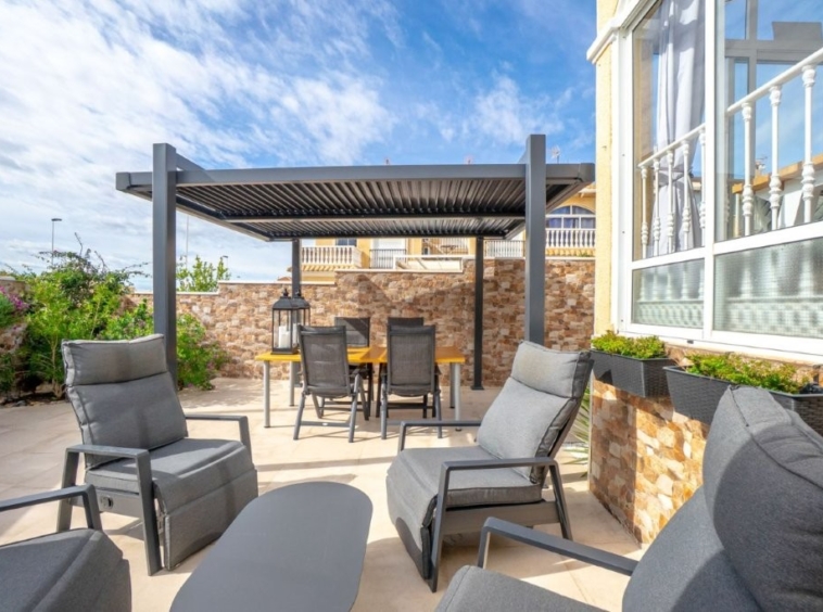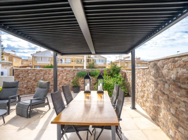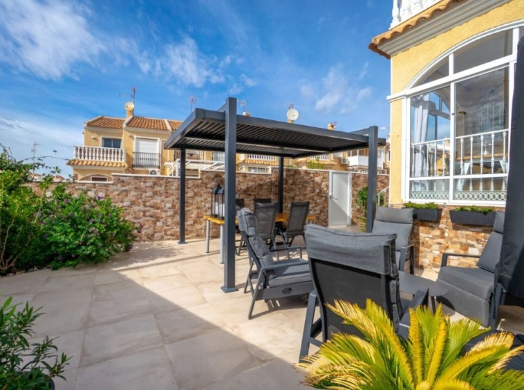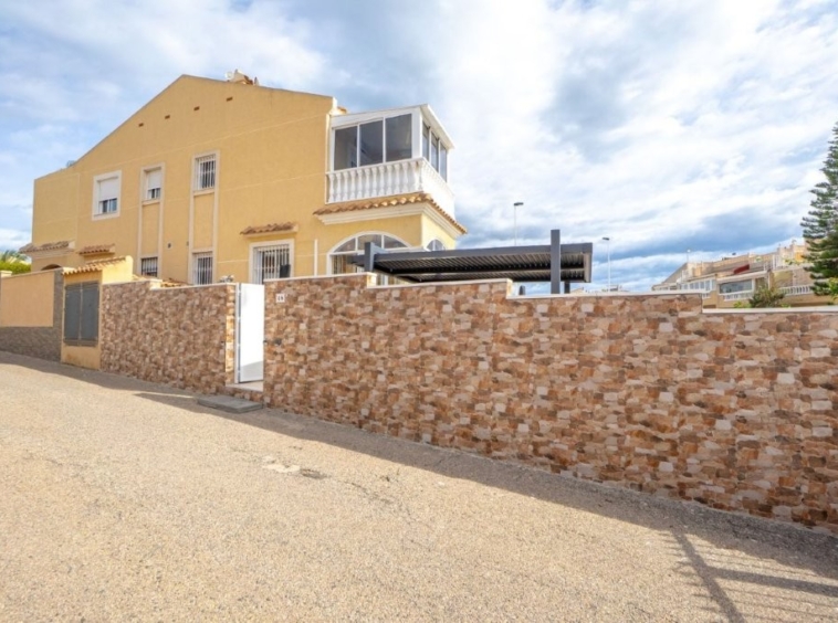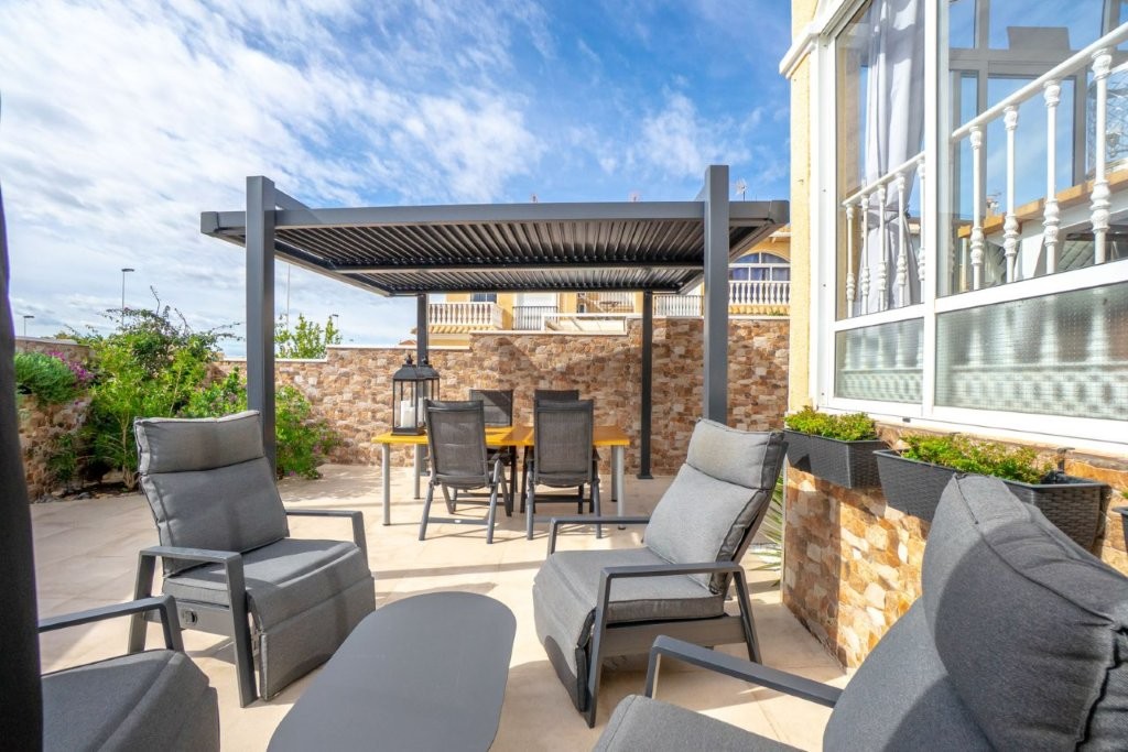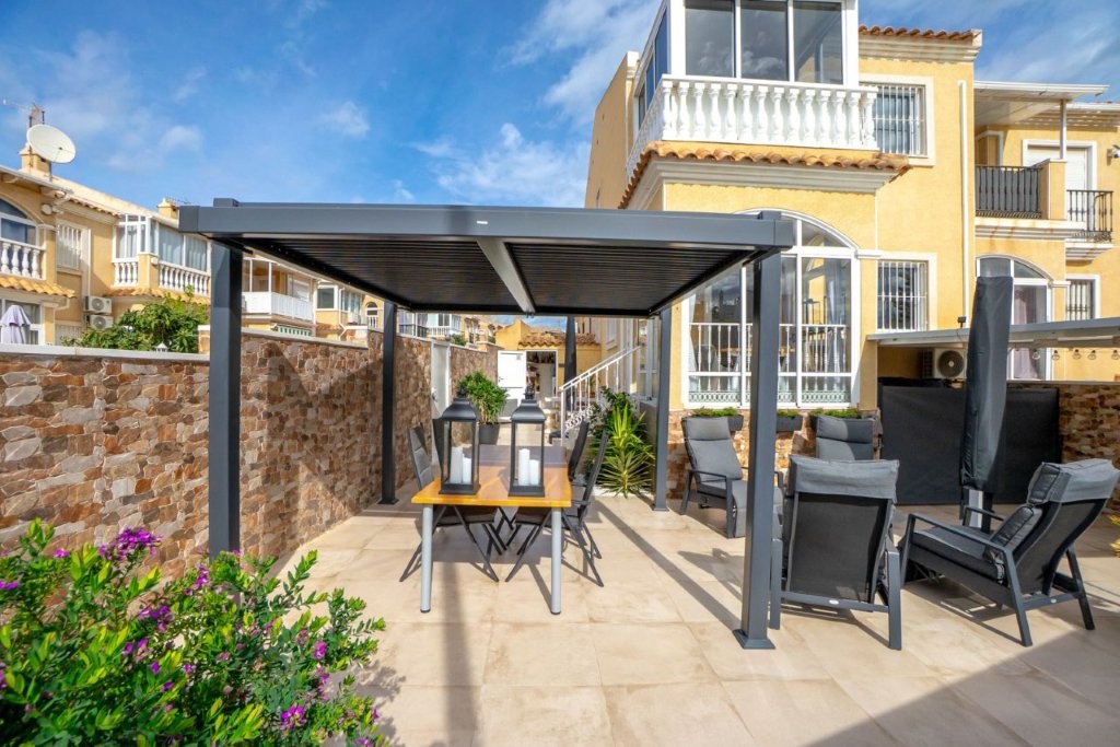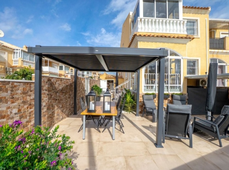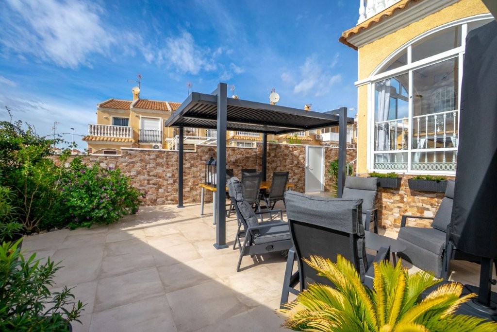 Detta delvis renoverade radhus ligger på en attraktiv hörntomt i söderläge om 126,58 m² i det populära Royal Inter Park 2 i Aguas Nuevas. Här får du goda solförhållanden och en rymlig uteplats med pergola, samt gott om plats för solstolar och flera sittgrupper.