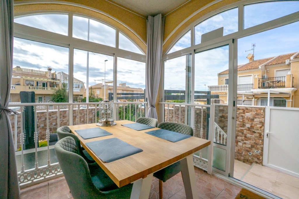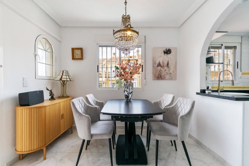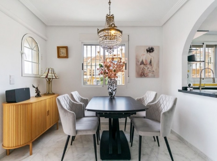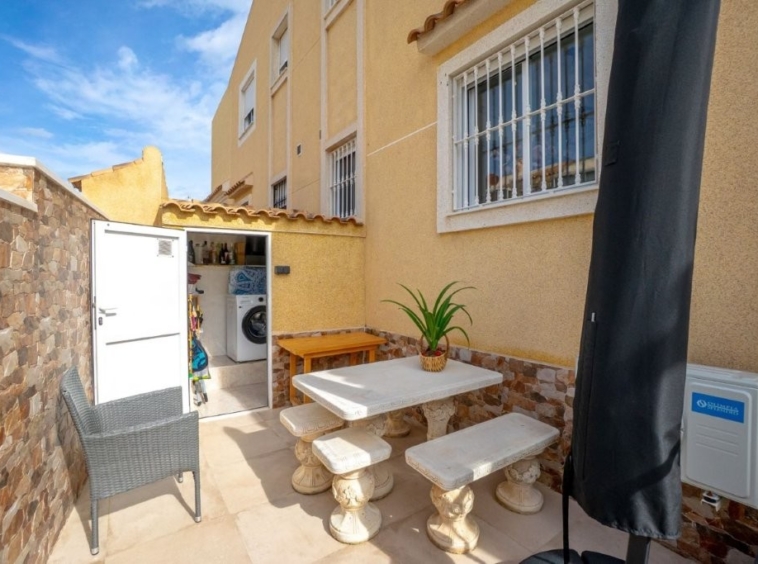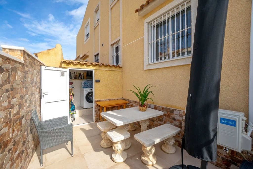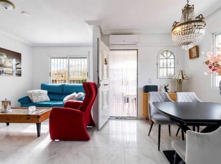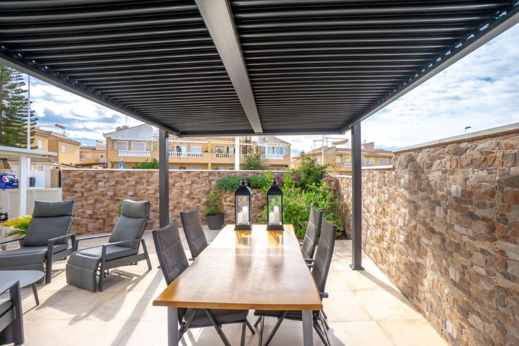 Detta delvis renoverade radhus ligger på en attraktiv hörntomt i söderläge om 126,58 m² i det populära Royal Inter Park 2 i Aguas Nuevas. Här får du goda solförhållanden och en rymlig uteplats med pergola, samt gott om plats för solstolar och flera sittgrupper.