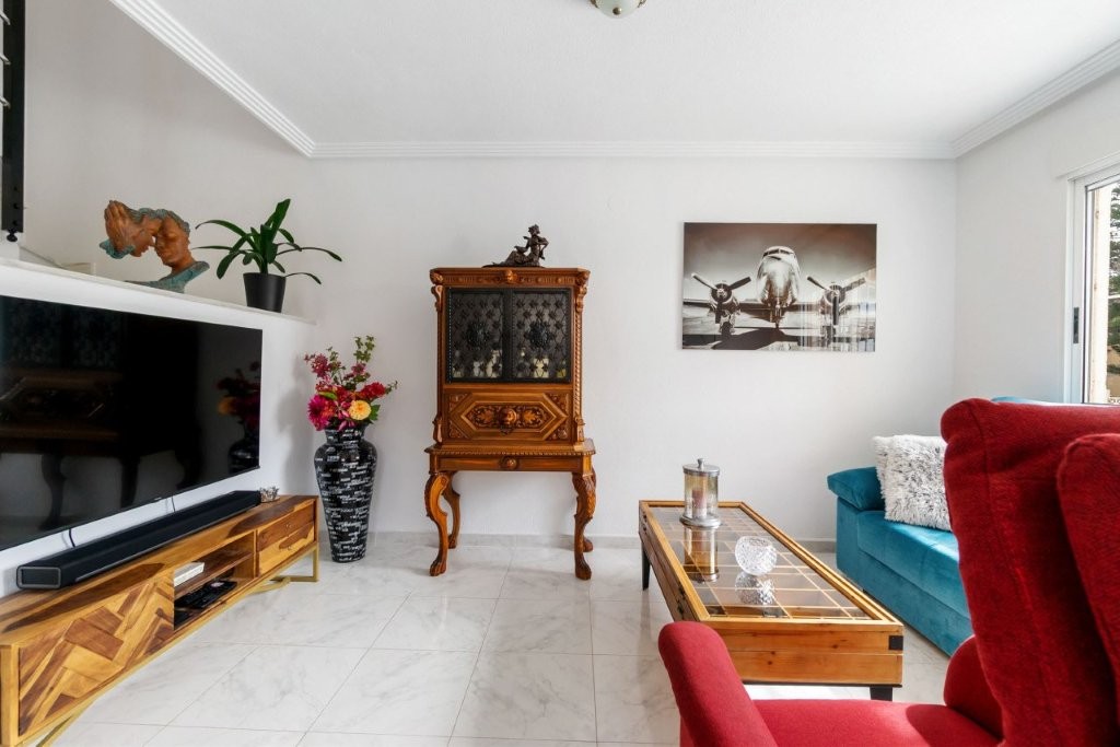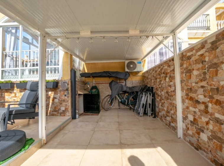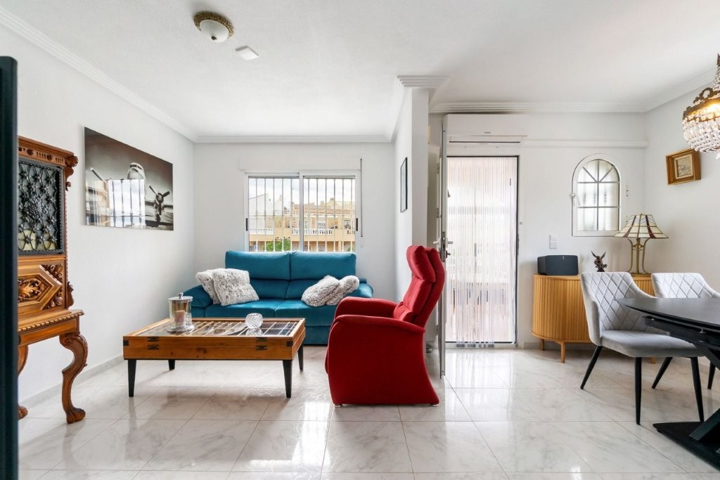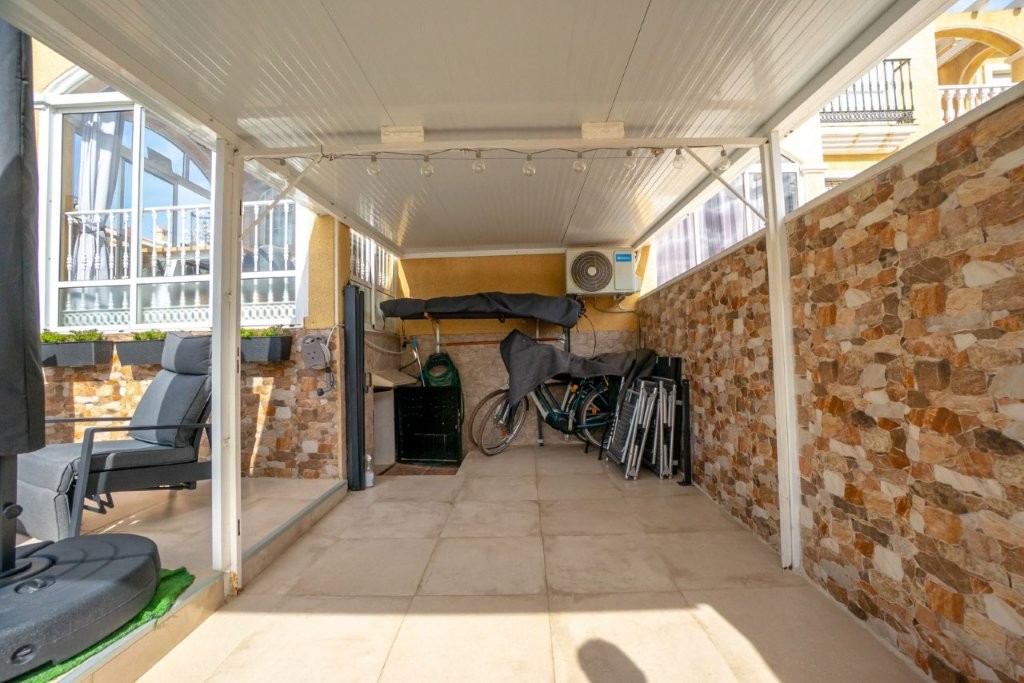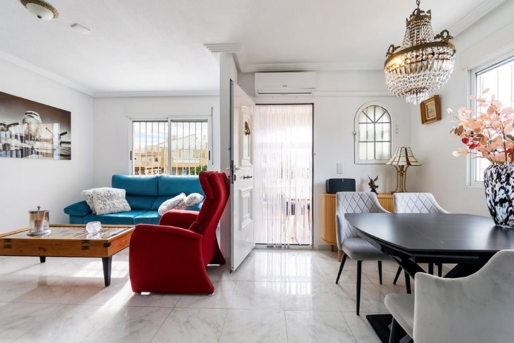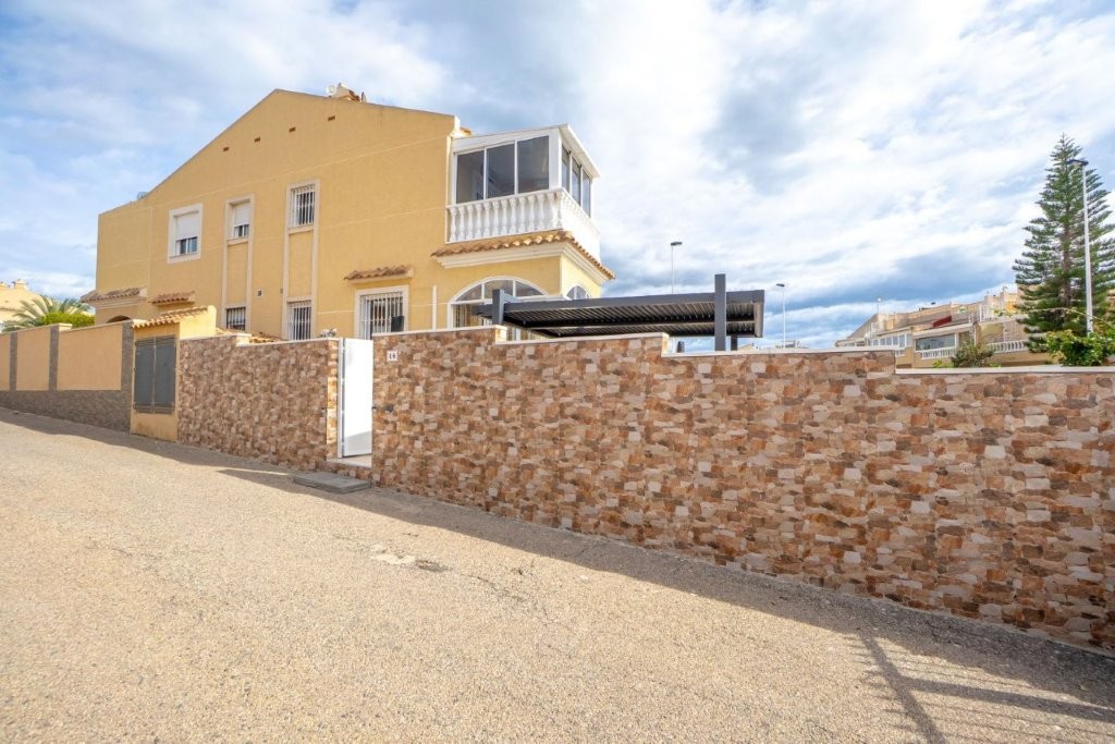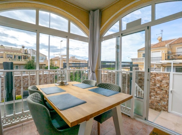 Detta delvis renoverade radhus ligger på en attraktiv hörntomt i söderläge om 126,58 m² i det populära Royal Inter Park 2 i Aguas Nuevas. Här får du goda solförhållanden och en rymlig uteplats med pergola, samt gott om plats för solstolar och flera sittgrupper.